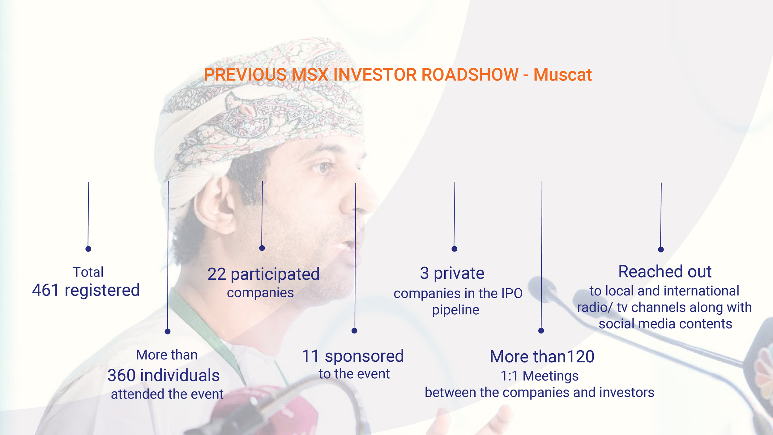 MSX Investors Roadshow is a great occasion to attract the attention of the global investment community and connect you with your target audience to introduce your latest developments and growth. In addition, participants name will be listing on all our event signage and event-related marketing and promotional collateral: invitations, emails, posters, and social media posts. MSX Investors Roadshow is an excellent event to network, cultivating new business relationships and allows firms to micro- target specific audience.